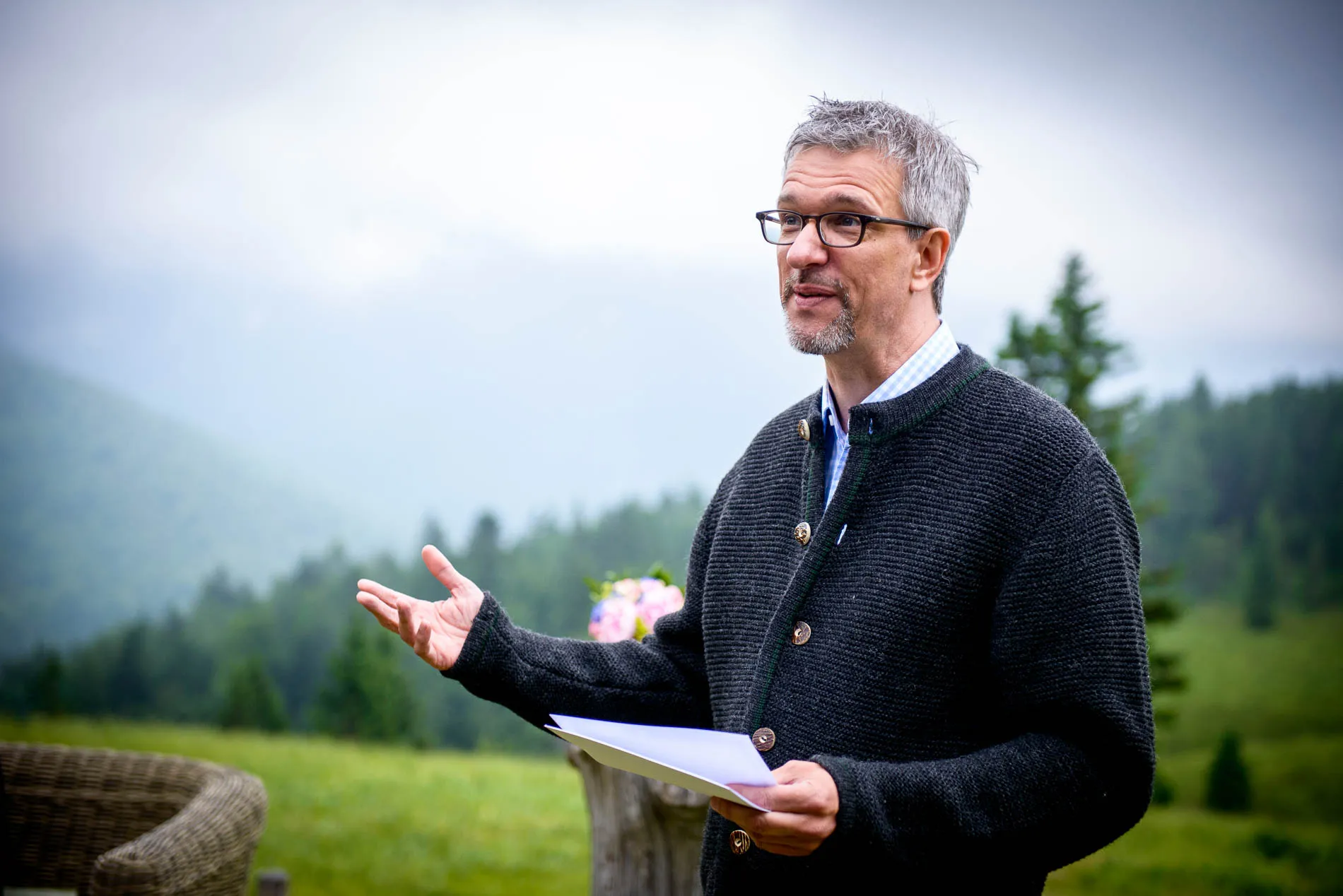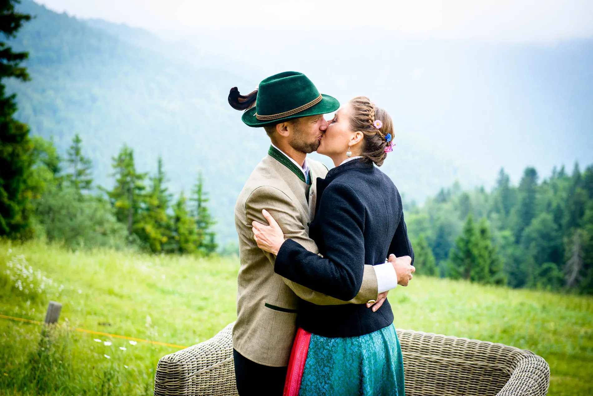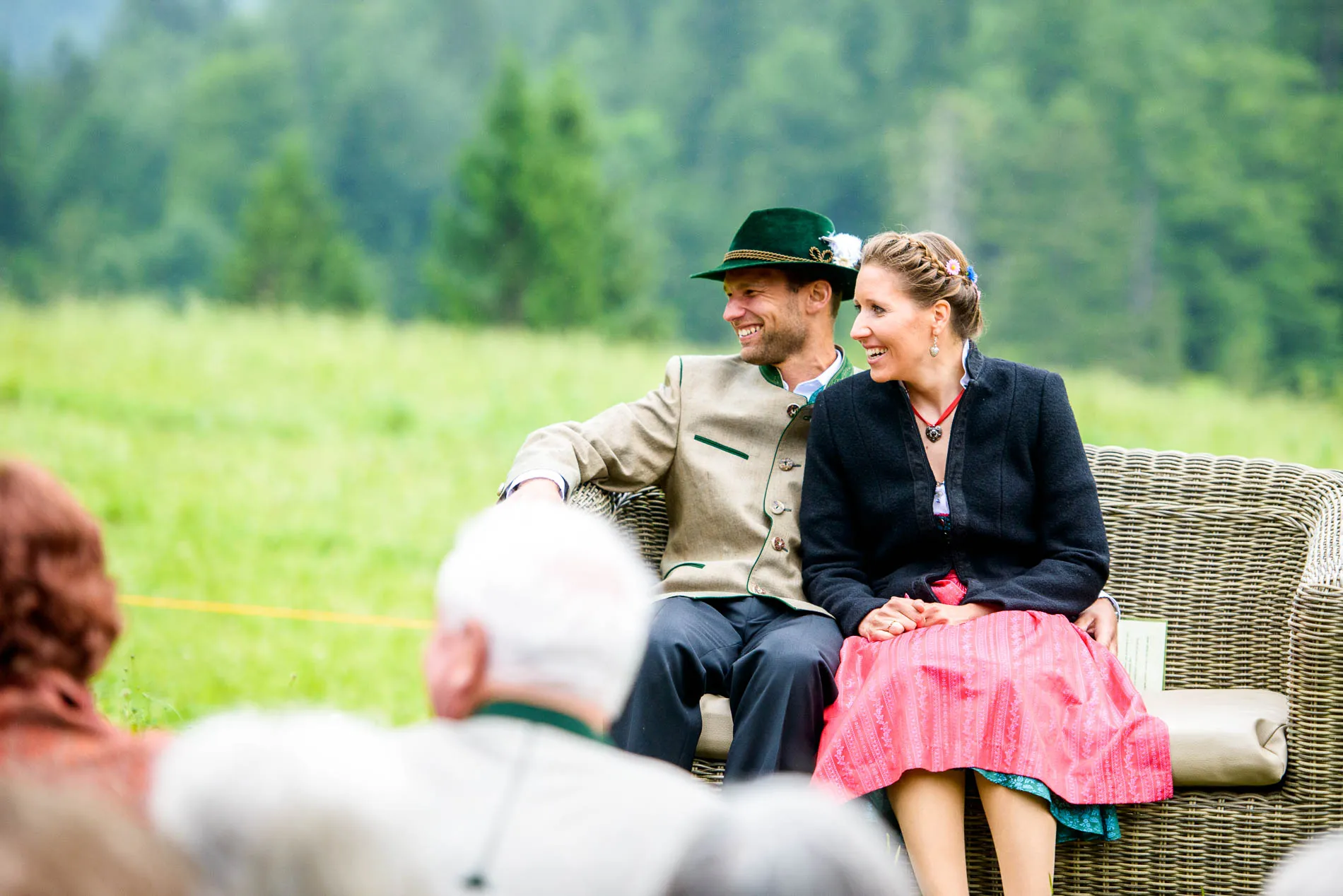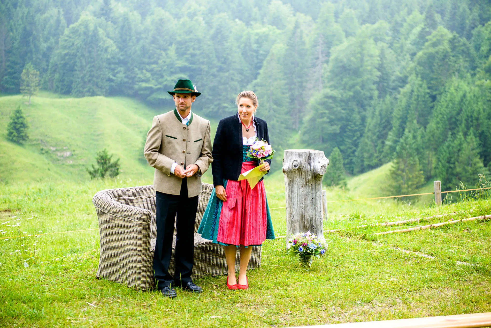 Das Wetter zeigte sich von seiner besten Seite, sodass die Trauung auf der Almwiese stattfinden konnte. Mit Blick auf die umliegenden Berge und begleitet vom leisen Rauschen des Windes entstand eine Atmosphäre, die kein noch so aufwendig dekorierter Festsaal hätte bieten können. Für mich als Hochzeitsfotograf Bayrischzell war es ein Geschenk: Natürliches Licht, emotionale Momente und eine Kulisse, die fast schon zu perfekt wirkte.
