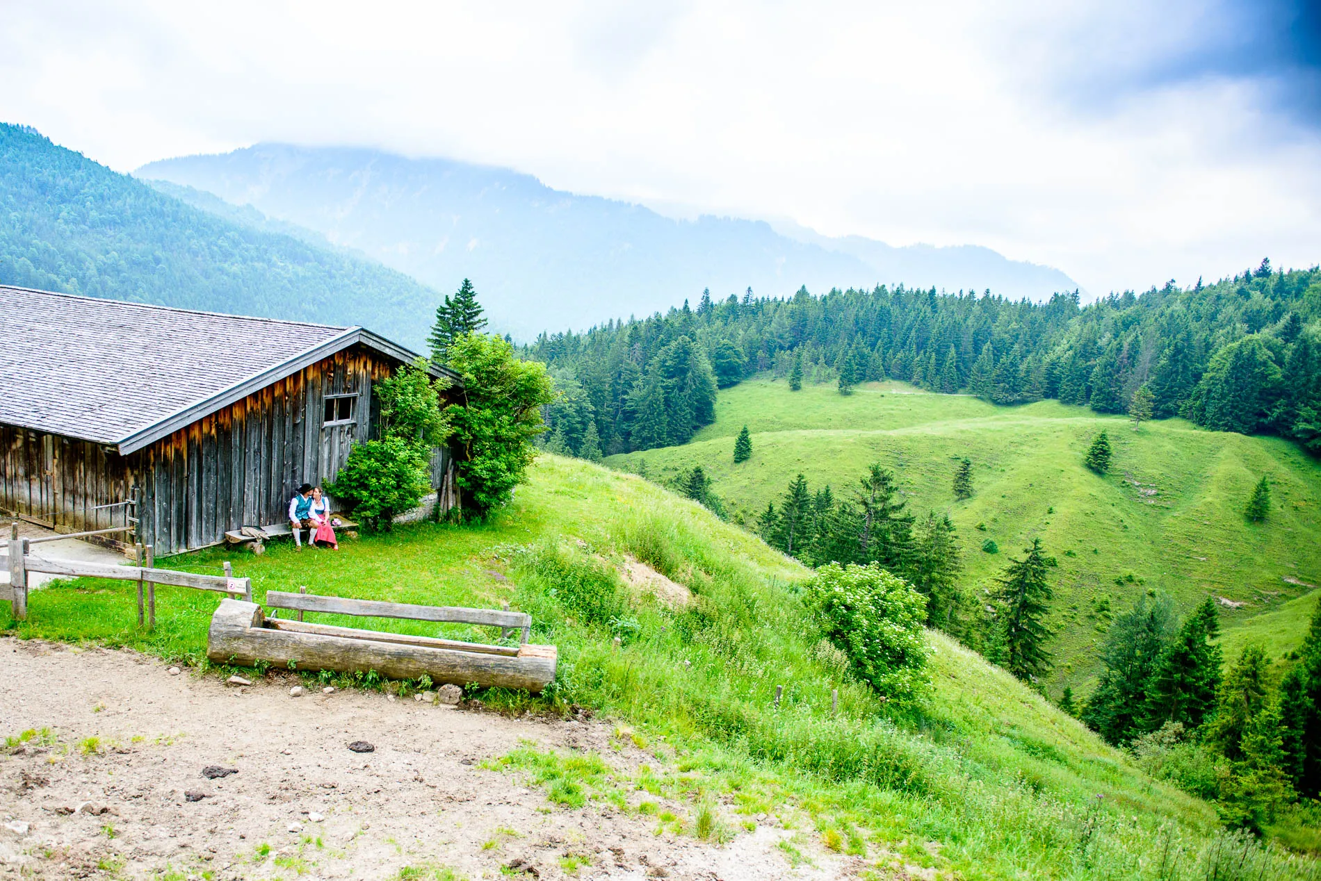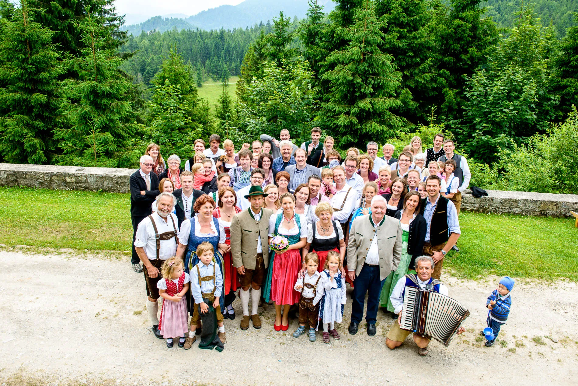 Eine Hochzeit auf einer Berghütte ist für Gäste – und auch für mich als Hochzeitsfotograf München – immer ein kleines Abenteuer. Das beginnt schon bei der Anreise: Von Bayrischzell aus geht es ein paar Kilometer ins Ursprungstal, wo der Parkplatz liegt. Von dort führt ein halbstündiger Fußmarsch über rund 200 Höhenmeter hinauf zum Sillberghaus auf 1.030 Metern. Wer den Weg in Dirndl oder Lederhosen zurücklegt, beweist nicht nur Kondition, sondern auch Stilbewusstsein. Schließlich sieht man nicht alle Tage, wie traditionelle Festkleidung und Bergpfad so harmonisch zusammenpassen. Zum Glück gibt es den Wirt mit seinem Geländewagen, der Gepäck, weniger wanderfreudige Gäste – und ja, auch Musiker und Fotograf samt Ausrüstung – sicher nach oben bringt.