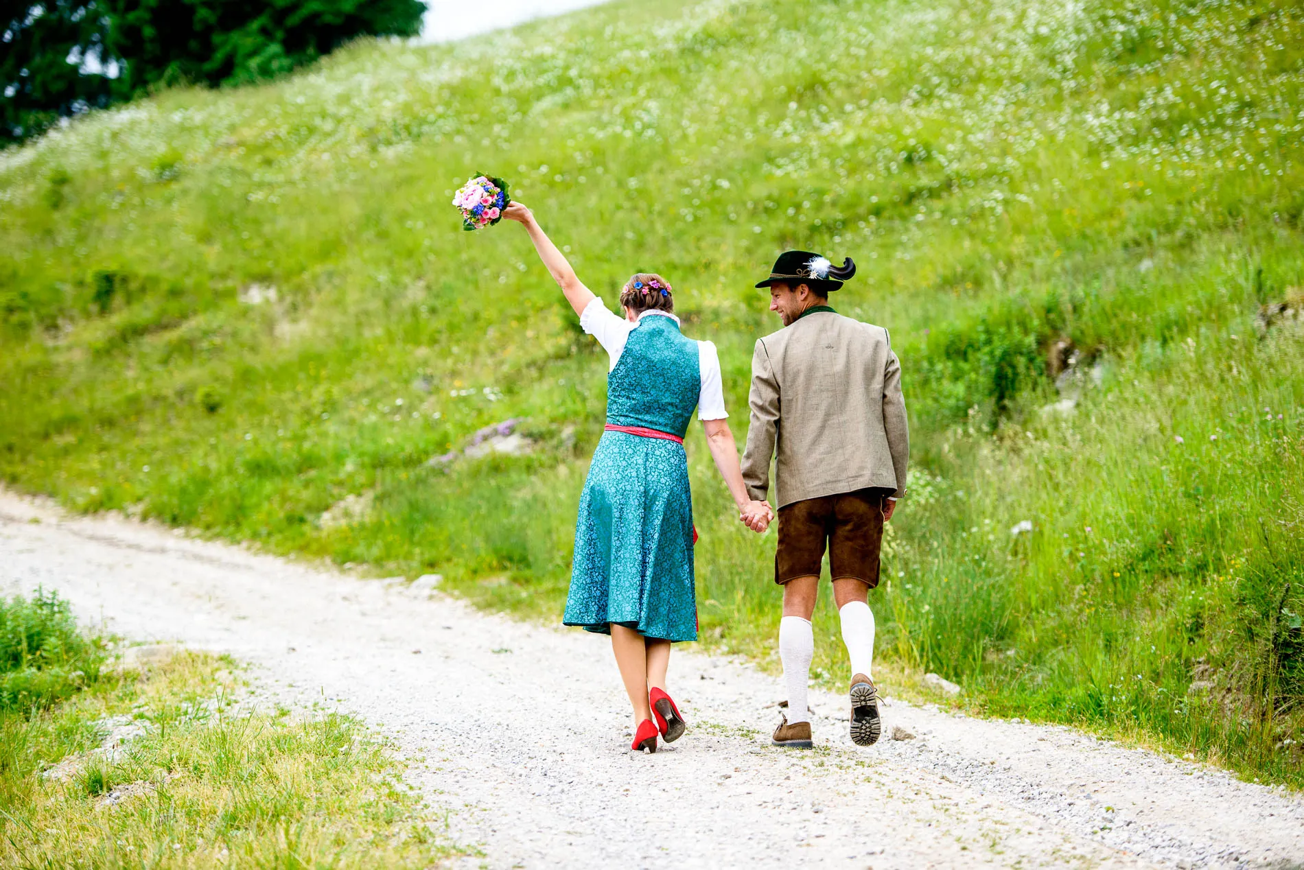 Brautpaarshooting zwischen Almwiese und Bewegung