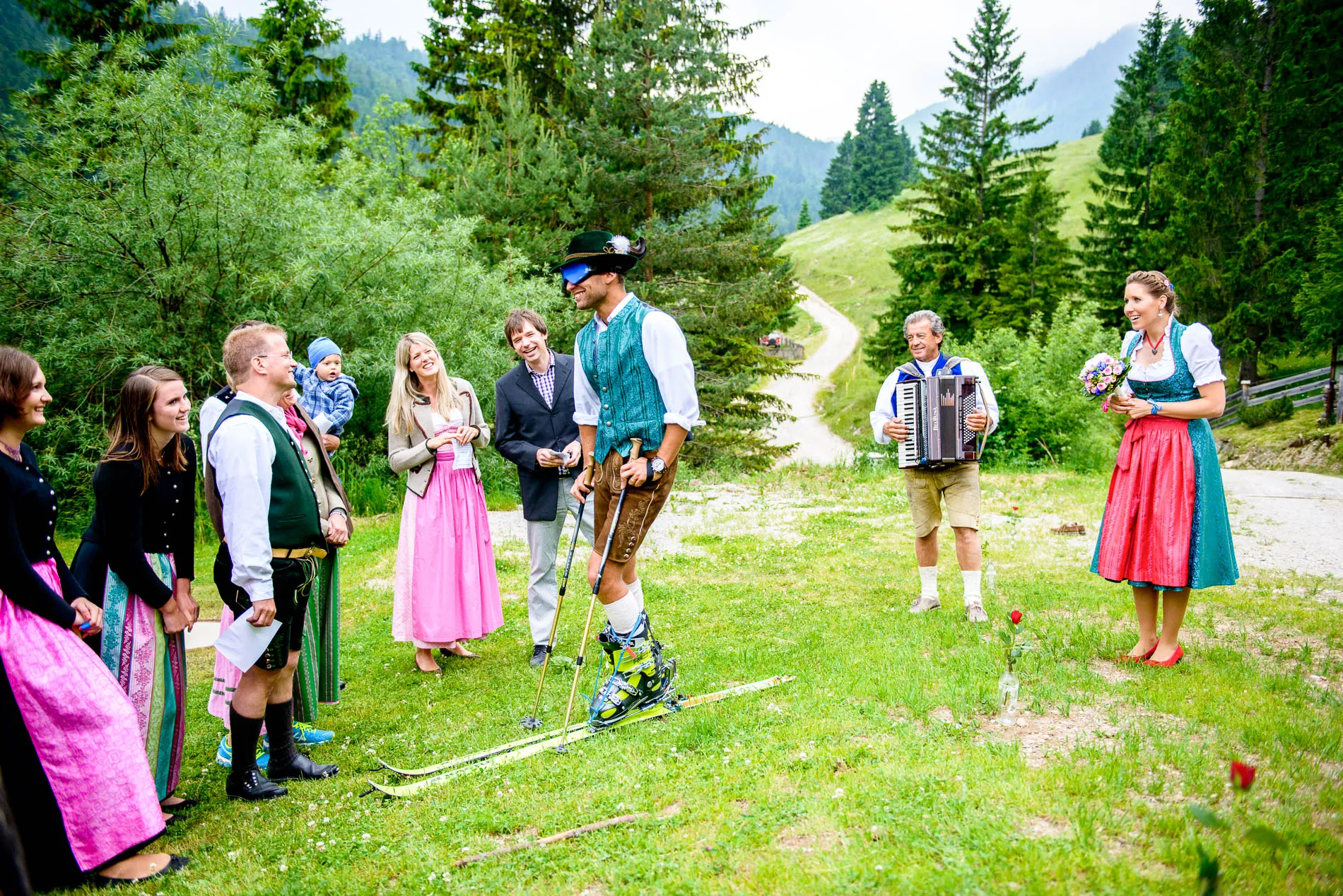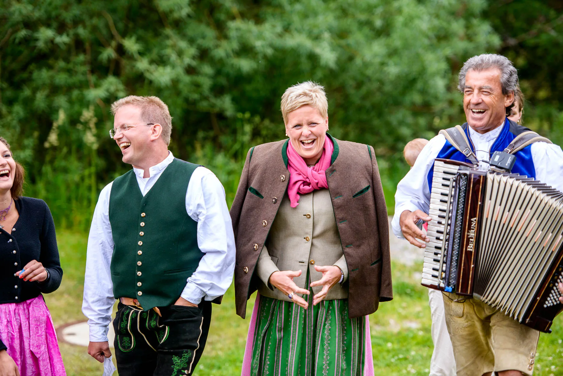 Oben angekommen, wartete schon der musikalische Empfang: „Bayern-Hans“ mit seinem Akkordeon. Während er die ersten Töne spielte, habe ich die ankommenden Gäste fotografisch eingefangen. Das Brautpaar wanderte gemeinsam mit den meisten Gästen hoch – und wurde so gleich doppelt begrüßt: musikalisch und fotografisch. Ein schöner Moment, der die Stimmung für den Tag vorgab: herzlich, entspannt und mit einer Prise alpiner Bodenständigkeit.