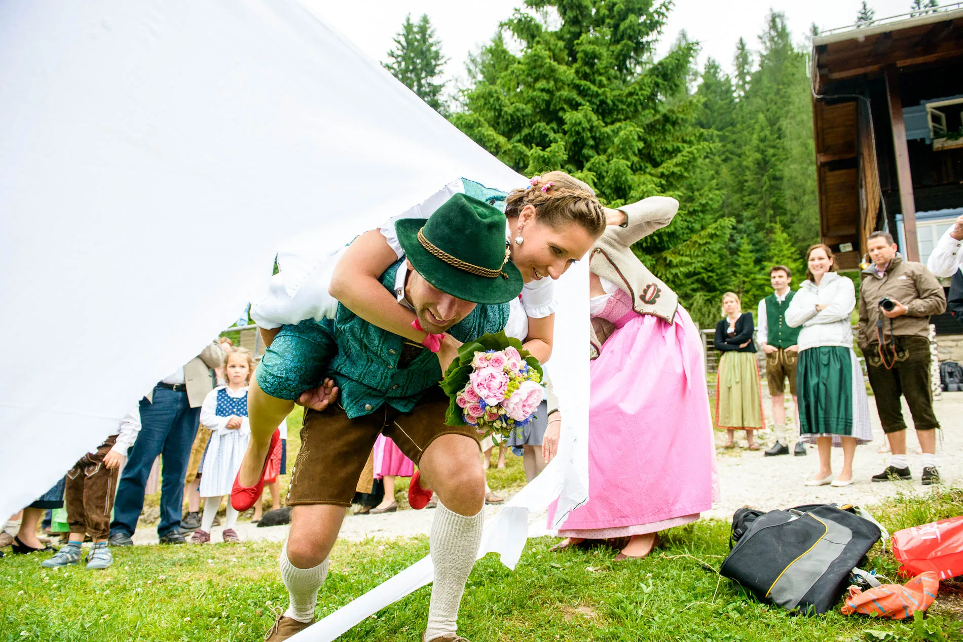 Natürlich durften auch die berühmten Hochzeitsspiele nicht fehlen. Besonders originell: Der Bräutigam musste mit Skistiefeln und Tourenski, die Augen verbunden, einige Aufgaben meistern. Ein Bild für die Götter – und für die Hochzeitsreportage. Danach folgte das klassische Herz-aus-dem-Bettlaken-Schneiden, das traditionsgemäß etwas weniger sportlich, aber nicht minder unterhaltsam war.